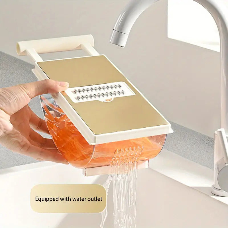 Haz que preparar tus alimentos sea más fácil, rápido y hasta divertido con este cortador multifuncional de 6 cuchillas. Perfecto para cortar, rallar, julianear o rebanar una gran variedad de frutas y vegetales con precisión profesional.